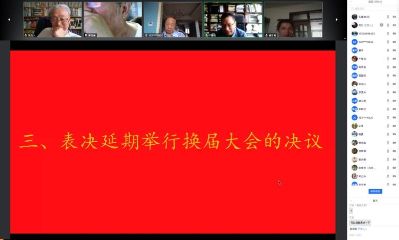 唐秘书长就延期换届的原因、必要性做了说明。就新一届理事、常务理事产生办法,换届领导机构组成等文件的讨论稿向会议做了汇报,提交了会议讨论。