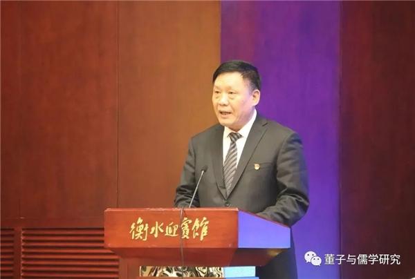 衡水学院党委书记王守忠致辞。王守忠在致辞中介绍了近年来衡水学院在加强内涵建设、深化转型发展,努力建成特色鲜明的应用技术大学过程中取得的丰硕成果,以及在立足衡水、服务地方,积极参与地方文化建设,研究、传承董子文化中取得的骄人成绩。